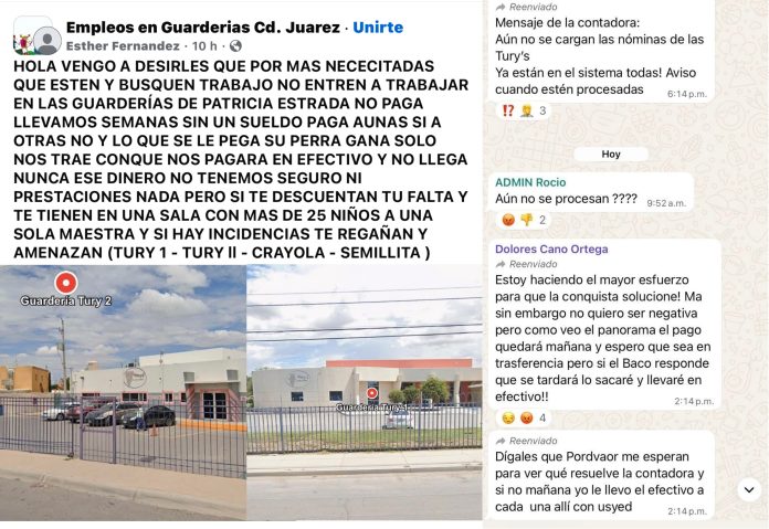 El señalamiento —difundido por una trabajadora en grupos locales— advierte a otras personas no aceptar empleo en guarderías identificadas como Tury 1, Tury 2, Crayola y Semillita, por retrasos constantes en el pago, promesas incumplidas y amenazas cuando el personal reclama su sueldo.